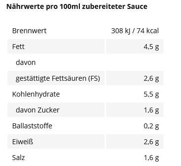 - Zutaten: Weizenmehl, 23% Butterpulver, Magermilchpulver, Sahnepulver, Salz, modifizierte Stärke, Geschmacksverstärker (Mononatriumglutamat, Dinatriuminosinat), 5% Eigelbpulver, Hefeextrakt, Verdickungsmittel (Xanthan), Säuerungsmittel (Citronensäure), Stabilisator (Diphosphate), natürliches Pfefferaroma, Farbstoff (Carotin), Gewürz, Antioxidationsmittel (Fettsäureester der Ascorbinsäure, Alpha-Tocopherol)